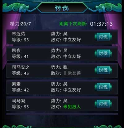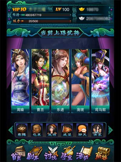 创建游戏角色后,直接进入游戏。和其他策略类游戏有所不同,《醉红颜》的游戏界面没有太多复杂的UI设计,画面以柔和为主,深蓝色的背景再加上粉红、浅紫等暖色调的搭配,整个画面看起来清新优雅,不会给人的眼睛造成太强烈的视觉刺激。游戏的角色界面由角色信息、上阵武将、操作按钮和功能导航四个部分组成,基本概括了角色成长、武将培养、系统玩法、社交互动四个游戏的核心功能。