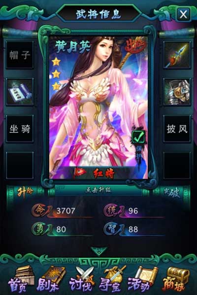 新版本当中的美人系统让小编着实惊艳了一把,虽说英姿飒爽的女将同样养眼,但是和这些娇滴滴的美人比起来还是缺少了一丝妩媚和妖娆。在游戏中,这些美人需要玩家达到一定的条件才可以进行招募,目前可招募的美人一共有5位,不同美人的招募条件也不相同。顺便一提,不要以为这些美人只能用于收藏和欣赏,踏上战场的她们同样是一名骁勇善战的强力武将哦。