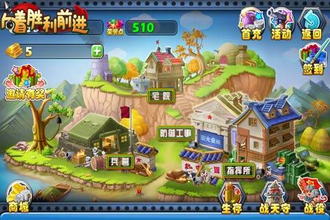 《向着胜利前进》提供了三种游戏模式:战役模式、战天守和生存模式。战役一共有50个关卡,玩家可以通过难度适中的轻松闯关体验游戏的主要剧情。战天守及生存模式都会在玩家完成战役模式第一战役后解锁。生存模式模式没有关卡结束点,关卡中出现的敌军难度会随着时间增加逐步提升。