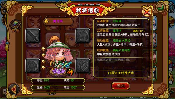 a. 黄月英(谋士):普攻:闪电球、武将技:复活自己并回复部分HP,每场战斗限1次