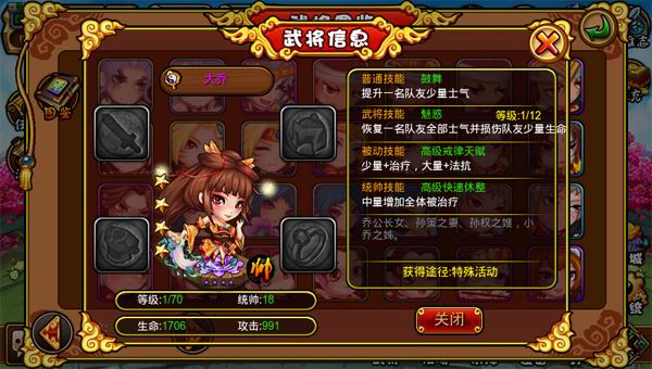 d. 大乔(方士):普攻:鼓舞、武将技:魅惑-恢复一名队友全部士气并损伤队友少量生命