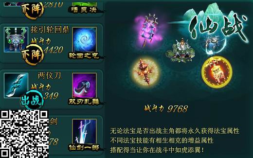 在《仙战》中,凡是已经收集到的法宝,其属性加成(如攻击、防御、生命等)都可以直接地,而且是永久地附加到玩家身上,但是法宝还有另一个功效,那就是特殊技能。《仙战》中共有二三十种法宝,每种法宝都有一个独特技能,其技能效果各不相同。而每位玩家的身上都可以装备4个法宝,只有已装备的法宝,才可以使用它的特定技能。