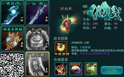 法宝不仅提供了效果各异的特殊技能,还能提供数值颇高的战斗力加成,因此各位玩家们可要努力收集法宝噢。通过渡劫提升自己的修仙境界,可以开放更多的法宝合成机会,接着再进入鸿钧仙境收集法宝合成材料,假以时日,你就可以召唤神龙啦!好吧开玩笑的……不过到了这个时候,你的战斗力一定已经逆天了,登上英雄榜前茅自然不在话下,那时候,还愁不能称霸《仙战》么?