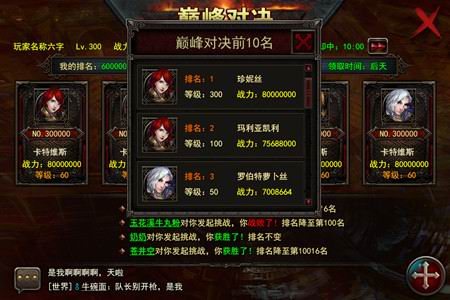 进入主界面 首次参与“巅峰对决”将会获得一个排名,排名为当前巅峰对决排名的最后一名。玩家可以通过挑战其他较高名次玩家来改变自己的排名,如果挑战成功,则与被挑战者互换排名,如果失败,则保持名次不变。