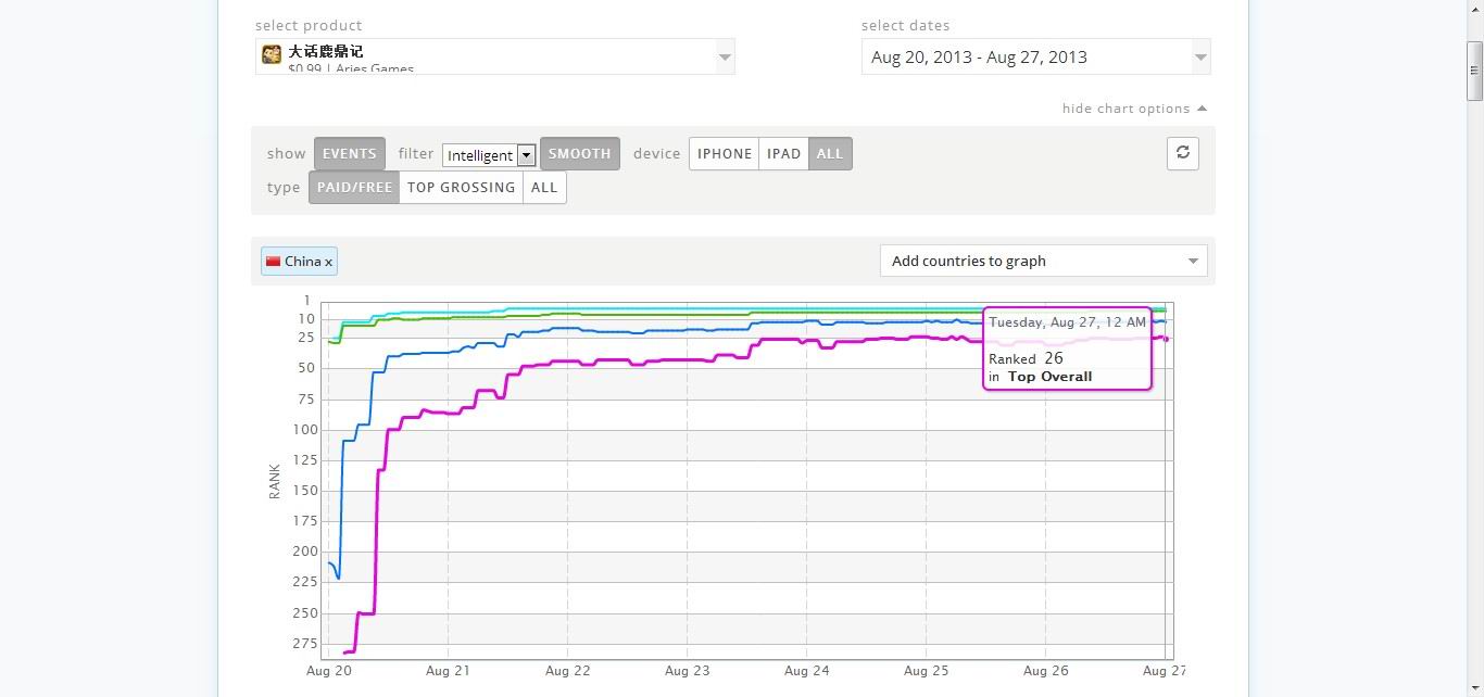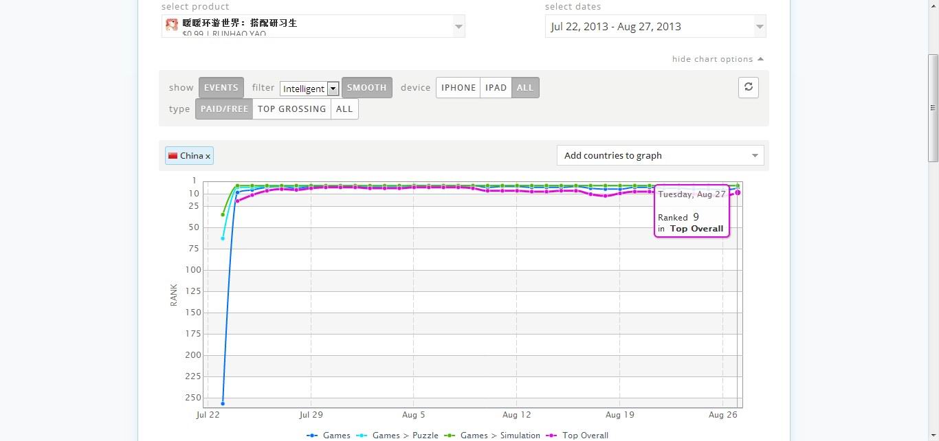 与以上两款产品有别的是,新进榜上有名的《大话鹿鼎记》与《暖暖环游世界》两款单机产品。从App figures中得知,《大话鹿鼎记》已牢牢占据了App store25名的位置,而《暖暖环游世界》则突破了前十名,位列第九。好奇之下,笔者专门付费下载了此两款产品一窥究竟,发现两款单机产品都有着比较相同的特点:两款产品用户在线时长都很高。其中一款是换装类的女性游戏,主打女性游戏。现在改产品一代免费、二代收费,该产品同样在2天内登顶日本总榜第一。《大话鹿鼎记》是一款标准RPG,至少有30小时游戏时间,结合高arpu设计,笔者为验证“游戏在线时长”理论,专门联系了这两家开发公司也证实了笔者观点。之前随着排名规则改变,Line、kakao、微信、易信的突然爆发,各个技术贴讨论的App store的新排名规则与DAU、评价、下载、用户打开数、同时在线用户数有多大关联,现在又出现了”在线时长”这个概念,还需要进一步跟踪验证。但无论是否与这些点有关,这两款游戏都逆流而上,说明部分高品质单机游戏开发商或发行商还是有机会在App Store与腾讯这样的用户巨鳄拼杀。