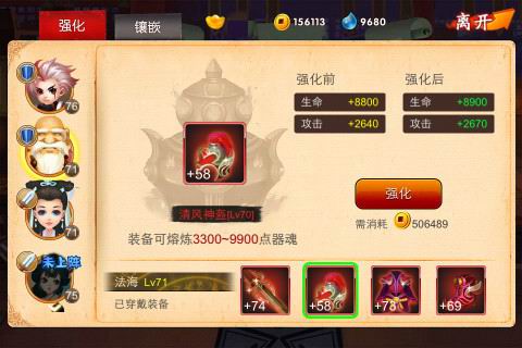 新版中新增聚魂玩法,玩家每天都能聚集一定器魂,根据挑战的精英副本进程来决定每日可聚魂的次数,聚魂有铜钱聚魂和元宝聚魂(VIP4开启)2种方式。普通副本、精英副本新增完美通关奖励和星级奖励,精英副本新增一个物品掉落(装备进阶石),玩家可在铁匠铺通过进阶功能把普通装备进阶为装备。根据副本通关的质量度给予评定,星级越高,奖励越多!