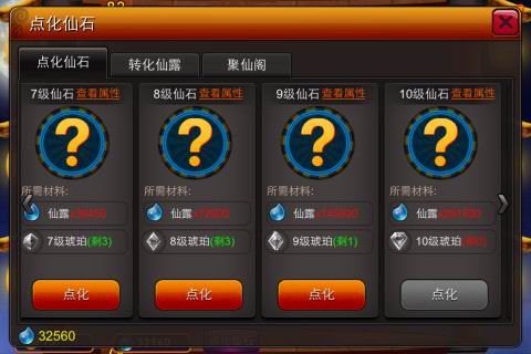 每天可进入聚仙阁可求取仙露,求取次数根据爬塔层数决定,爬塔等级越高,求取仙露的次数越多!有了聚仙阁,仙露获取不再是梦啦!高级仙石转化就是那么简单!