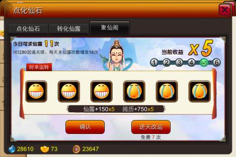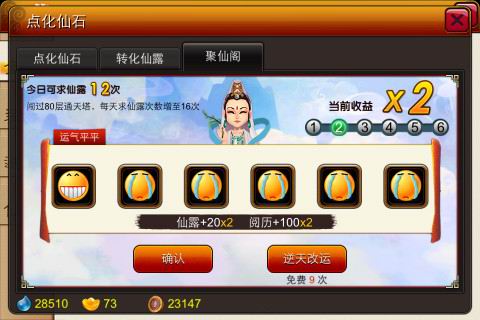 对自己求仙露的奖励不满意,逆天改运帮你忙,聚仙阁每天有10次免费改运的聚会,每一次的改运都是逆天滴,因为每次点击逆天改运都会帮你获得更多的奖励哦!