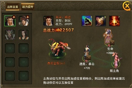 《大侠传》的站位分1号,2号,3号三个位置,因为异兽的出阵加成这一设定的存在,你的两个侠侣以及你本身主角就不可以随便站位,而要根据加成属性合理分配,这对于战斗力的提升,可不是一点两点。