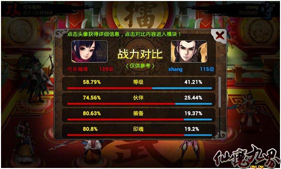3、竞技场、好友切磋、护花、劫花中的战斗结果可查看战力对比,有了这样的对比,玩家可以清楚了解到自己与好友属性之间的差距,尽可能有目的的提高自己比较差的属性.