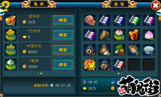 鬼市商人有点儿像咱们的“地下市场”,这里有各种各样的商品,既有提升实力的强化石、鬼器,也有清水、肉之类的食材。道具也分两种,元宝道具和金币道具,每次刷新是否能得到需要的物品就要看大家的人品值啦!