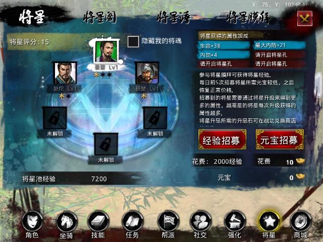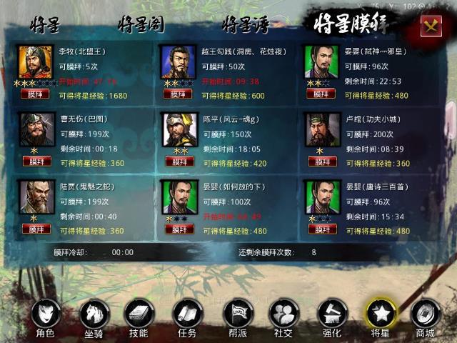 将星还可以通过升级,来提升加成属性的数值和范围,经验可以通过“将星膜拜”等活动获取,亦可以从通过关战役获得!