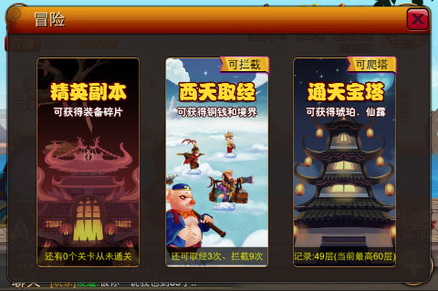 《囧西游》冒险系统险象环生,精英副本千变万化、西天取经体验九九八十一难、通天宝塔闯关取仙石,玩家每进入一层就会遇见一个怪,层级越高,怪物越厉害。当然只要玩家打败怪物越多,获得的奖励也会相当丰厚。