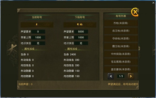 《大侠传》当中每当声望达到了一定的数量,就会自动获得一个称号,而每个称号给予主角的属性加成,完全不亚于套装的效果!比如烈枪的称号从低到高总共有16个,最低的“烈枪”称号需求声望5000点,加成为:生命2400外攻330内攻330外防150内防150;最高的“武林至尊”称号需求声望100万,加成为:生命25900外攻3600内攻3600外防1600内防1600。这样对比可见,声望提升对玩家本身的属性加成非常可观,从2400生命到25900生命的加成,这已经算是脱离量变达到质变了。