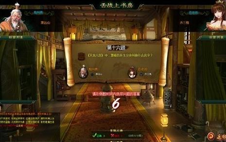 舌战的题目范围很广,大多来自经典武侠小说的剧情,以及游戏之中一些细节,比如:金庸武侠诠释了“侠”之真谛,请问“侠之大者,为国为民,个人生死荣辱置外”这句经典话语出自何人之口?张真人可能说出自杨过之口,蓉妹妹则说出自郭靖只口,相信知道聪明的玩家们一下就猜出了正确答案!