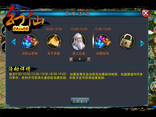 此外,仙魔战场还有仙魔大乱斗的活动。每日三个时段9:30-10:00,;12:30-13:00,18:30-19:00,仙魔至尊石会出现在地图内,玩家以仙道或者魔道进行争夺,半个小时的争夺时间,胜利的一方可获得大量经验与名望奖励,失败一方也会适当获得奖励!