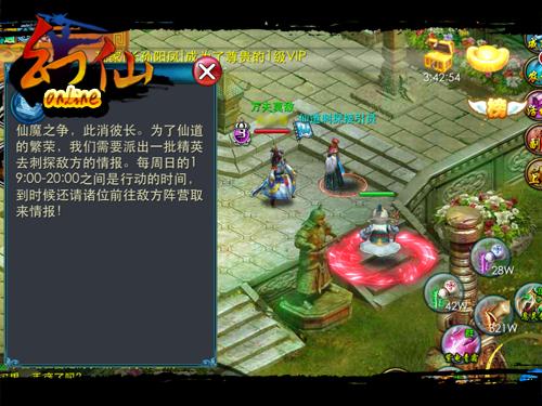 “仙魔战场”是日常活动,任何时间玩家都可以独自或者组团前往仙魔战场地图进行刷怪刷经验。玩家可点击UI的活动直接传送到马夫点,进入地图。进入地图之后可以到找仙道(魔道)NPC接取突袭魔道(仙道)任务。因为击杀的怪物实力较强,玩家必须备好小药与奶妈前往哦~完成任务即可领取丰厚的奖励!绝对是玩家升级、刷经验的好地方!