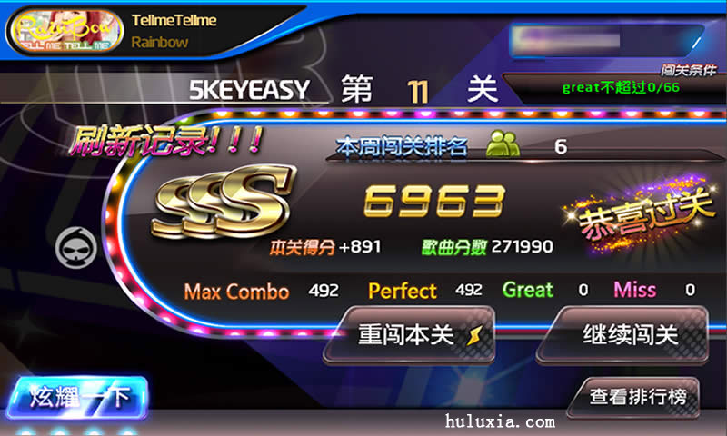 因为音符的下降速度变慢了,但是音乐没有变慢,所以当音乐结束的时候我们的游戏还得继续,直到最后一个音符降落完成才算游戏结束。不过没关系,为了取得节奏大师的高分这点小问题就可以忍啦。下面给大家看用葫芦侠通关后的评价。