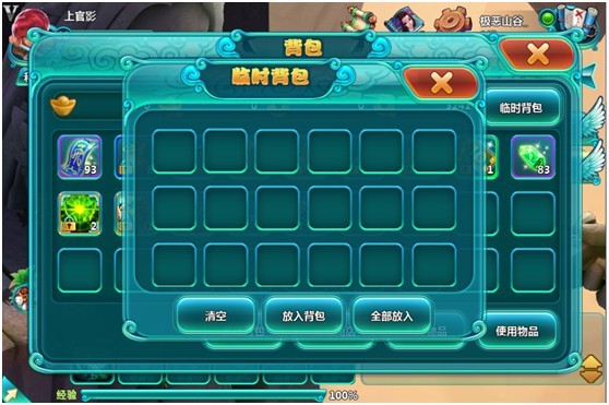 超大号的背包算什么?超大的临时背包才算真正的高端大气上档次!自从有了超大的临时背包,你能收获的战利品一件也不遗漏!通过打猎所收获的物品如果太多,系统会让这些物品自动放入临时背包。