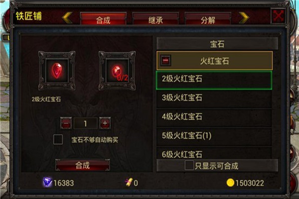 玩家可以通过副本,挖矿等活动获得宝石,每一种不同颜色的宝石对应不同的属性,而每一种颜色的宝石又分为10级,等级越高的宝石对属性的强化就越明显。玩家可以通过合成,使用一定数量的低级宝石兑换高级宝石,而当宝石不足的时候,玩家也可以通过消耗魔晶来自动补足缺少的宝石,合成自己想要的宝石。