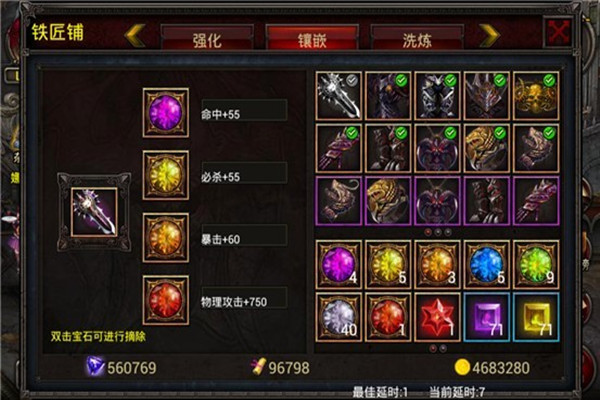 宝石取得后,只要镶嵌在自己的装备上即可。每一件装备都有四个插槽,而插槽的开启则需要消耗打孔石或者紫晶,每件装备镶嵌任意一种颜色的宝石只能镶嵌一颗,宝石也可以消耗礼券或紫晶从装备上取下。