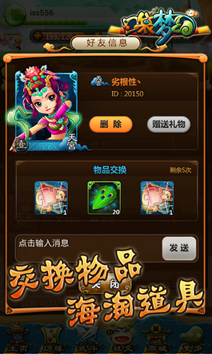 交换物品,顾名思义,玩家间可以互相交换道具、卡牌碎片。在每个好友的信息界面中,你可以看到他们提出交换的物品,如果你和他是密友,就可以用你身上一件物品去换你想要的物品。你的密友越多,可换的物品也就越多,就像在跳蚤市场淘货的感觉一样,经常可以淘到你刚好缺少的道具,就连稀有的紫卡碎片也可以交换到手,非常方便。