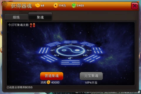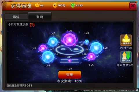 聚魂有铜钱聚魂和元宝聚魂(VIP4开启)2种方式,每一次的聚魂都有三次免费随机成长的机会,随机成长可能帮您聚集更多的器魂。但是随机成长机会可是有风险的哦,有时候聚集的器魂成长到一定点可是会爆破的哦!