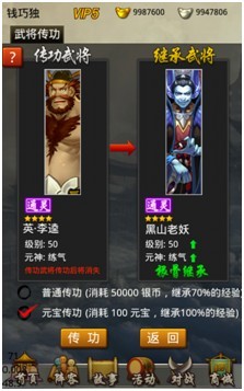 玩转“武将传功”需要一些眼力:除了传功武将的等级需要大于继承武将,继承武将的品质要高于或等于传功武将这两个条件,你还需注意已上阵的武将不能作为传功武将,作为继承武将则是可行的。
