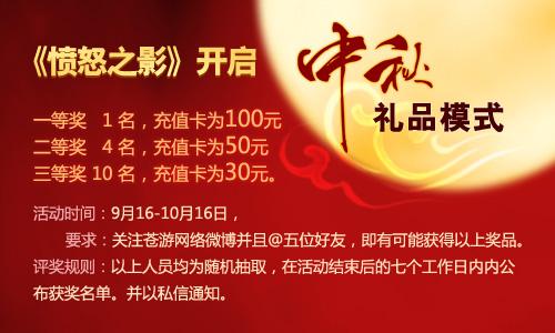 在这个月圆人团圆的日子里,爱情和亲情让我们关系更加融洽,也让生活充满了友爱和希望。如此难得的节日又和十一小长假连在一起,难怪网上众人都要被接下来的日期弄得混乱不已了,而这样的节日没有礼品又怎么说的过去呢!在此,苍游网络公司为了感谢众多玩家对《愤怒之影》的支持,为大家准备了充值卡礼品,只要在活动时间内关注我们的微博并且@五位好友,即有机会获得免费的充值卡。
