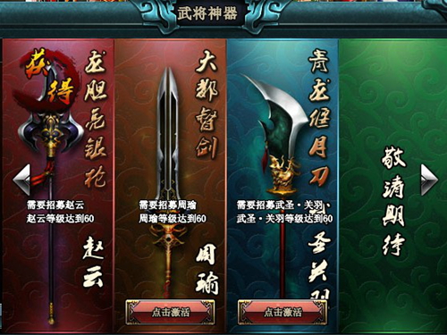 武将神器,顾名思义,武将与神器是密不可分的。目前现实的神器包括常山赵子龙的【龙胆亮银枪】、羽扇纶巾周公瑾的【大都督剑】和武圣关羽的【青龙偃月刀】。要想获得这三柄神器,你就需要招募对应的武将【赵云】、【周瑜】和【武圣?关羽】。其中,【赵云】和【周瑜】的招募要求你有极高的声望,而【武圣?关羽】这位足以突破天际的神将则需要你持有御赐【点将符】才能招募。每位武将到达60级,就能拥有足够的手眼和对神器的体悟,从而激活相应的武将神器。