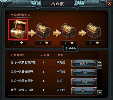 玩家达到15级就能开启活跃度系统。与一般系统不同,活跃度系统几乎不影响你的日常活动——更确切地说,你的几乎所有日常活动都能影响活跃度系统,让你获得一定的奖励。盖因活跃度系统是跟其他各种系统紧密贴合的,不论是淬炼一次技能石,完成一次神佛的游历,还是完成一次天命的探索,等等日常琐事,都能让你获得一定的活跃度。当活跃度达到一定要求,就能打开对应的宝箱获取奖励。