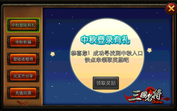 9月19日至21日 ,在这三天里,只要登陆游戏的玩家,都可在领奖界面领取到中秋登陆奖励哦。月饼月饼,你在哪里?我就在你轻轻一点的刺激里。