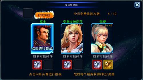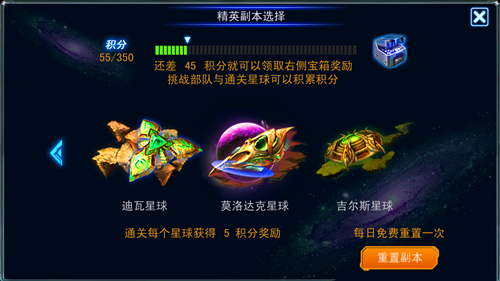 在浩瀚的银河之中,成千上万的行星坐落在巨大星图上,行星域是位于重要航道上的区域,也是游戏中资源来源途径之一副本。马拉特星球是银河争霸途中占据重要战略位置,少年们跃迁该区域进行击杀,便可开启精英副本。银河VIP勇士享受享受战斗加速功能,每天可以免费开启10次精英副本,10次后要消耗行动力。另外享有一次免费重置次数,VIP3可以花费暗物质再重置一次,VIP5将可以花费暗物质重置两次。首次通关精英星球会获得大量声望和点券,除此之外还会随机掉落会谈金币、银币。