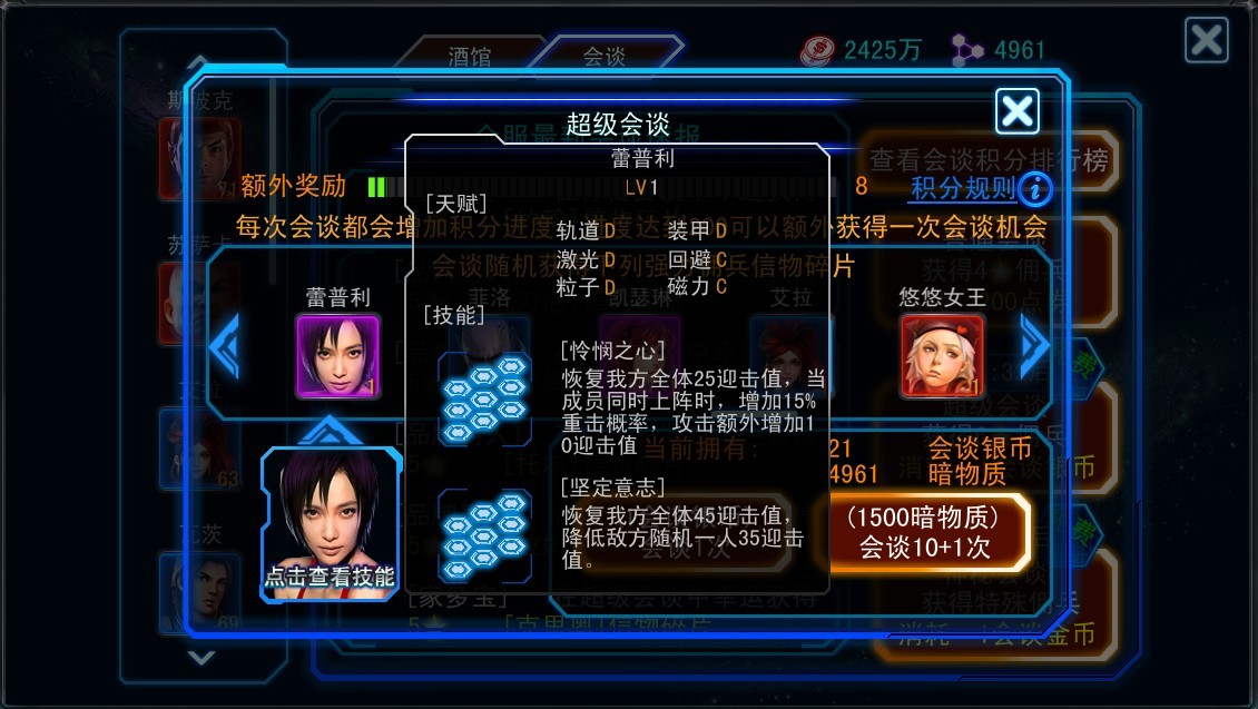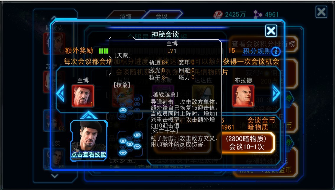 会谈系统是针对《银河英雄传》的忠实粉丝独创的福利回馈,玩家每段时间都会有一定免费会谈次数获得英雄。此次来自异界空间的超能力新英雄,只有雷普利是可以再超级会谈中获得,兰博,托尔和洛基只可通过神秘会谈中获得相应的信物碎片。
