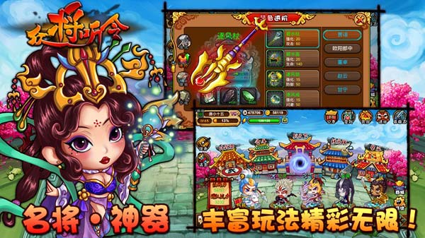 《众将听令》的第一章节三国篇已开放至尾声,作为第一章节《众将听令》就拥有了近300个不同的原创武将角色,同时采用了3层动态背景的设计,使战斗场景更动态。不论从角色数量,系统丰富性上,制作精良度上都是2013你不得不玩的一款手游大作。