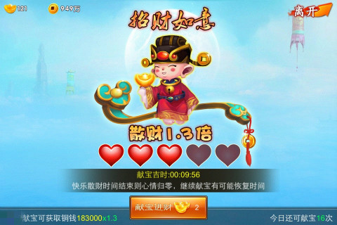 2.招财进宝:前五次是只需要2元宝的,这样一天花个10元宝获得差不多100万左右的铜钱,这个小钱是划算的。
