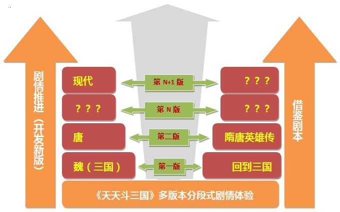 事实上,《天天斗三国》最大的亮点是多版本分段式剧情推进体验,玩家的目的是从三国回到现在,途中历经唐宋元明清等朝代的变迁,这种变迁震撼将随着游戏的后续新版开发而展现得淋漓尽致。由于没有过多细节透露,外界猜测这种分段式体验,可能类似某些单机RPG设置:举个例子,玩家下载三国版本,通关完毕,接着下载唐朝版本,可选择继承三国版本部分通关数值再进入到一个全新的游戏世界观。