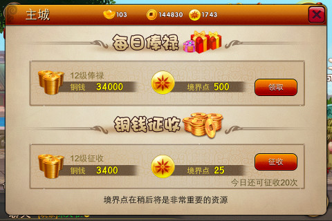每天登陆可以根据等级领取俸禄,此外还有多大20次的铜钱征收和境界点获取,每天累积下来可是一笔不小的财富呢!