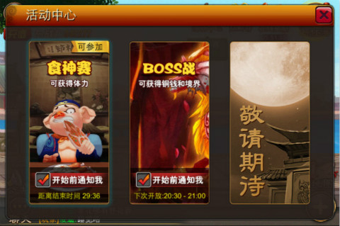 食神赛为内置的一款小游戏,每天有2次开放时间,分别为:12:30-13:00、18:30-19:00,每次开放时间为半小时,游戏规则类似"水果忍者",游戏结束后可获得10点体力和铜钱;体力可叠加。世界BOSS是《囧西游》新增的一个多人玩法。所有玩家可以在活动时间一起击杀世界BOSS,击杀世界BOSS可以获得铜钱和境界奖励。世界BOSS开放时间为: 20:30-21:00.