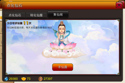 每天可进入聚仙阁可求取仙露,求取次数根据爬塔层数决定,爬塔等级越高,求取仙露的次数越多!(通过通关宝塔第五层的时候每天就可以免费求仙露5次,当通关第十层的时候,次数会增加到6次,之后每10层增加1次)。在点击求仙露之后,界面上的六个表情就会开始滚动,出现笑脸则可以获得较多的仙露和阅历,而哭脸则较少。同时在右上角还有一个收益显示,分别为1-6,当达到六级收益的时候,待会你求的仙露和阅历都会乘以六倍!非常可观啊!每次求仙露玩家都有3次免费的机会逆天改运,这个逆天改运就是让那些哭脸全部重新滚动(笑脸不会再滚动了,这个设定非常人性~)同时,逆天改命也会改变当前的收益等级。