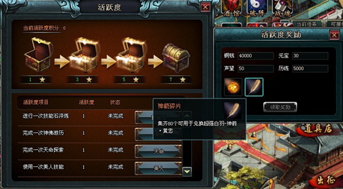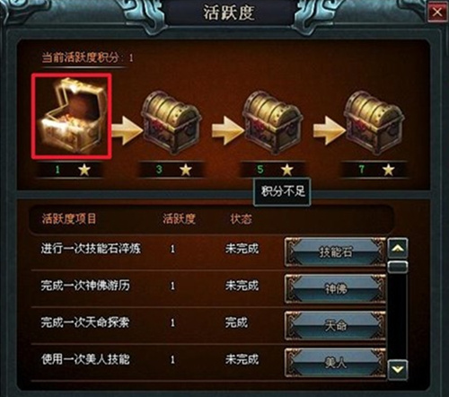玩家达到15级就能开启活跃度系统。与一般系统不同,活跃度系统几乎不影响你的日常活动——更确切地说,你的几乎所有日常活动都能影响活跃度系统,让你获得一定的奖励。盖因活跃度系统是跟其他各种系统紧密贴合的,不论是淬炼一次技能石,完成一次神佛的游历,还是完成一次天命的探索,等等日常琐事,都能让你获得一定的活跃度。当活跃度达到一定要求,就能打开对应的宝箱获取奖励。