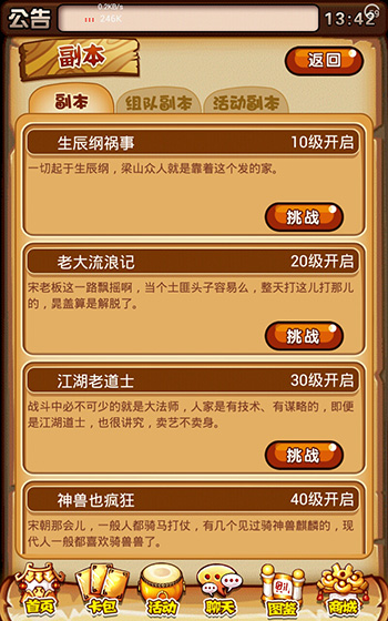 本次开放了组队副本系统,玩家可在游戏内组队挑战BOSS,目前支持4人组队。另外还增加了活动副本,比如即将开始的国庆活动,玩家在副本中可以获得超值奖励。除了增加的副本外,还提高了日常副本中各种物品的掉率,方便大家获得自己想要的武将。