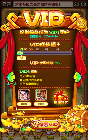 在山寨部分购买界面,现在可以手动输入自己想购买的物品数量了,再也不用一个一个买了。大转盘开放了刷新机制,如果对当前转盘中的奖励不满意,可以直接刷新一组新奖励。恢复了山寨每日三次内政刷新机制,同山寨成员在讨伐列表中也增加了信息显示。精力购买次数也可以根据VIP等级增加了。