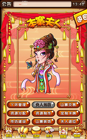 不过,你不能认为夫人只是给对方生产资源加速,就不上心去保护。夫人可以将山寨内政生产的各种资源,分配给指定的山寨成员,还可以和其他山寨进行资源交易。在建设司,夫人可以制造布匹、木料、皮革、石块、铁锭等资源。所以,夫人对于山寨的意义是非常重大的,你的夫人被抢走后,自己山寨的生产速度会大大下降,还会影响对外的交易。不过,当夫人被抢后,山寨寨主可以发起抢夺,夺回夫人。自家的夫人,一定要多加保护啊。