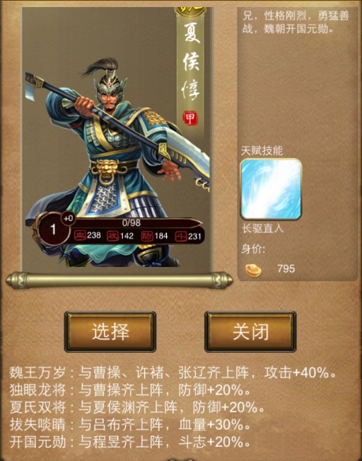 1+1>2法则告诉我们团结起来的力量往往大于两人力量的简单之和。想在《赤壁东风》中组建高战力团队,并不一定执着于高级武将,将三围视作神圣不可侵犯的准则,专精“武将奇缘”也能让阵型战力提高到另外一个境界。就上图夏侯淳来说,其“武将奇缘”共有5项,分别为魏王万岁、独眼龙将、夏氏双将、拔矢啖睛、开国元勋,加成给力到不行!