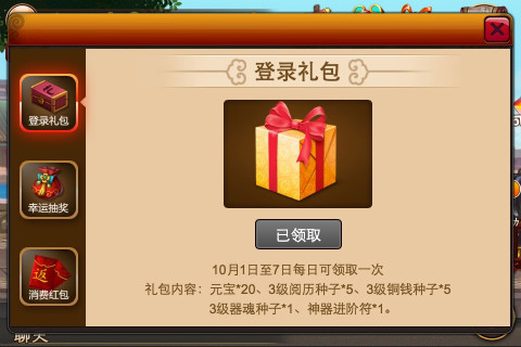 【活动奖励】:元宝*20、3级阅历种子*5、3级铜钱种子*5、3级器魂种子*1、神器进阶符*1