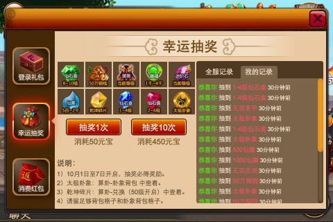 2、每天可免费抽奖1次,第2次开始需消耗一定元宝,抽奖无次数限制。