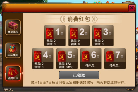 【活动说明】: ①每天消费元宝和铜钱的10%,在隔天0点作为红包暂时寄存。