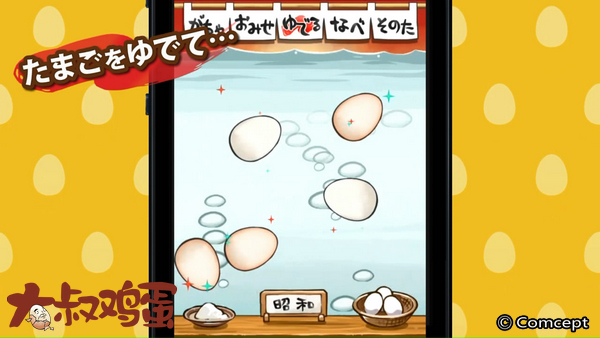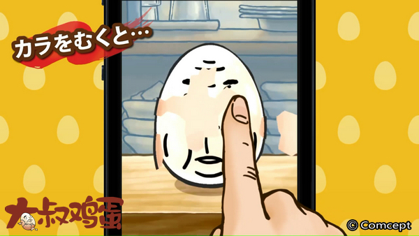 稻船敬二和Comcept公司已经和上海通耀达成合作,上海通耀将在国内独家发行运营《大叔鸡蛋》,游戏将很快测试上线, 想体验一款毁三观的手游,做一次重口味的日式鸡蛋料理,就玩《大叔鸡蛋》吧。