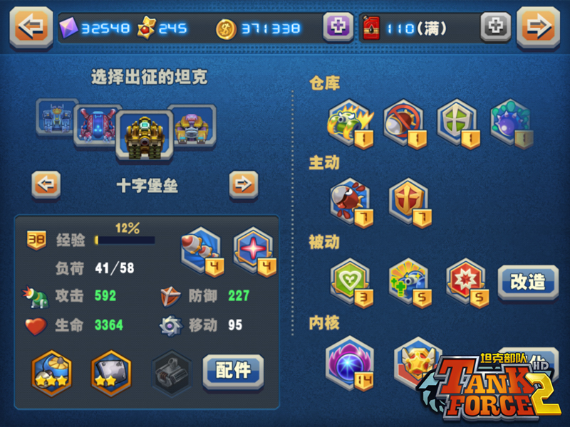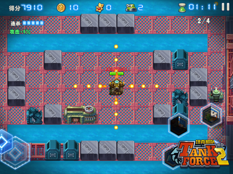 《坦克部队2》中的坦克主角一般会有两个天赋技能,主动和被动技能各一个。十字堡垒的天赋技能是“连发攻击”和“四向攻击”。被动技能“四向攻击”是十字堡垒最大的特色所在,它使得十字堡垒可以同时攻击四个方向的敌人,“连发攻击”是主动技能,使用之后十字堡垒将快速发出三颗子弹,可以瞬间对四方的敌人爆发出超高的伤害。除了两个强大的技能,小编还发现了十字堡垒的一项隐藏属性,它可以无视“城市”关卡中的传送带地形,这也让玩家在使用十字堡垒通关“城市”关卡时具有得天独厚的优势。